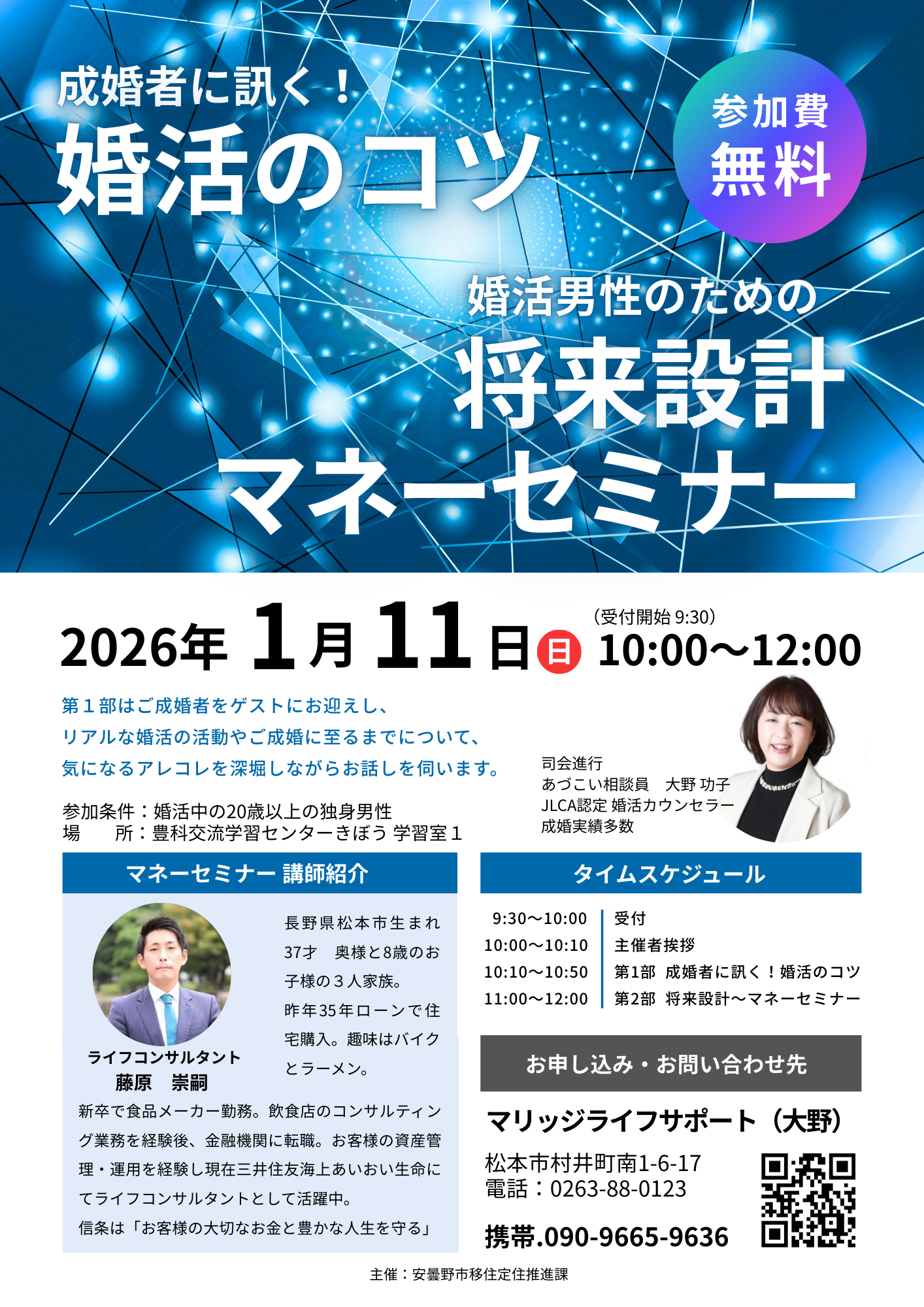 - 内容 「成婚者に訊く!婚活のコツ」「将来設計〜マネーセミナー〜」